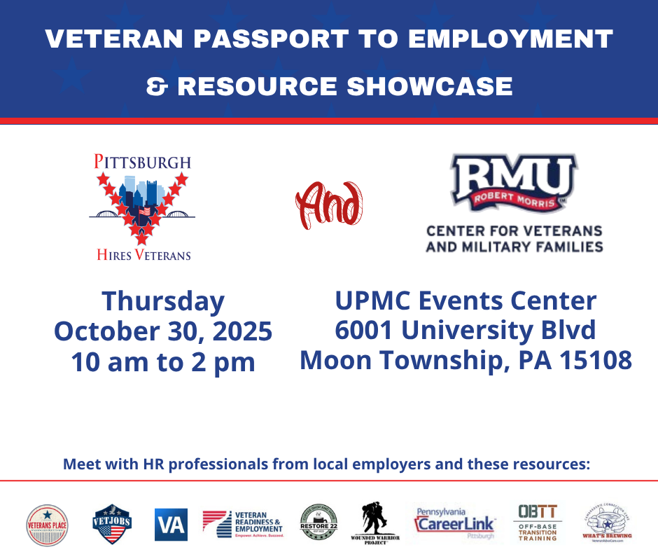 Join us on Thu October 30, 2025 at 10:00 AM at the UPMC Event Center at RMU. This event is open to veterans and veteran spouses and is designed to help you find meaningful employment opportunities. Connect with HR professionals from local employers get tips and advice on your resume writing and interview skills, and network with fellow veterans.… |