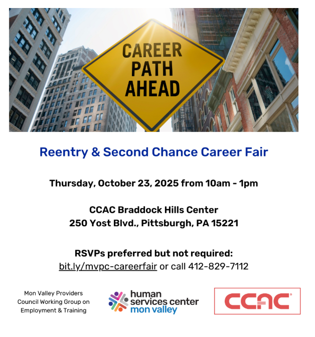 ![]() Visit with local employers, free training programs, and service providers who want to help you find your career path! This event is designed for individuals with justice system involvement, but anyone in the community is welcome to attend to also find their career path. Sponsored by the Mon Valley Providers Council Working Group on Employment… |