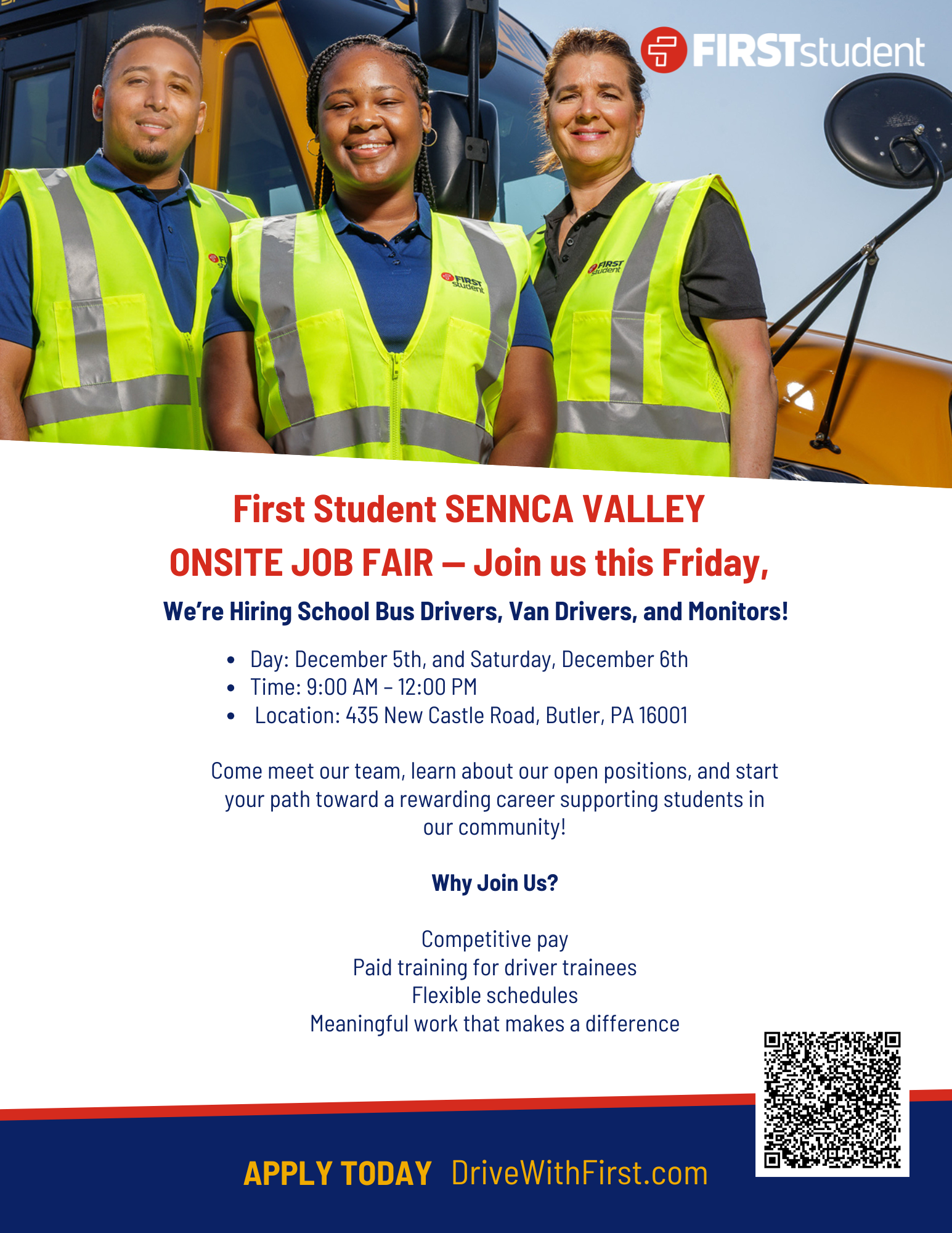 Meet First Student and learn about your path toward a rewarding career! Competitive pay Paid training Flexible schedules Sign on bonuses Follow the link for more details |